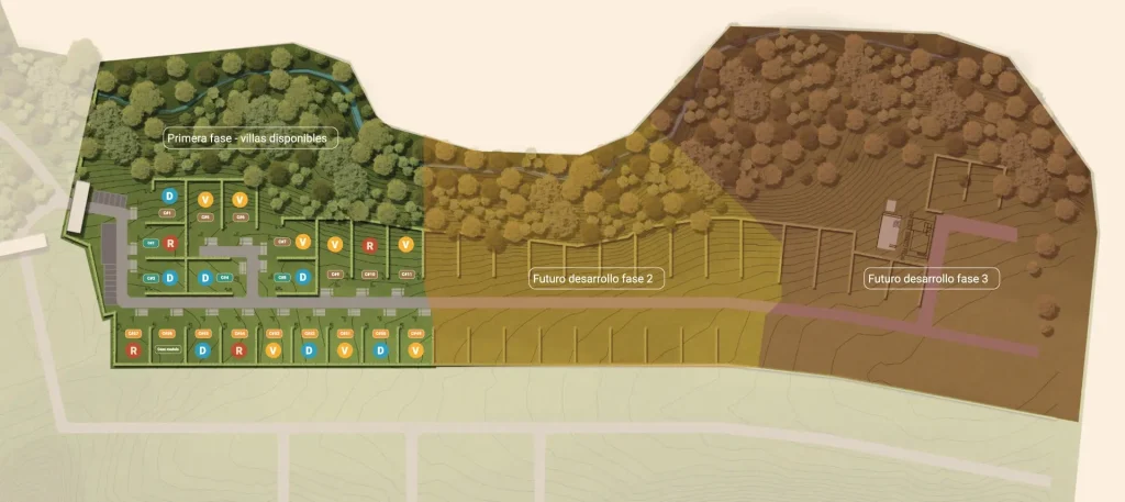 La verdadera privacidad requiere espacio. Descubre cómo hemos distribuido estratégicamente nuestras villas de la primera fase a lo largo del terreno para garantizar que cada familia tenga su propio ecosistema rodeado de bosques.
